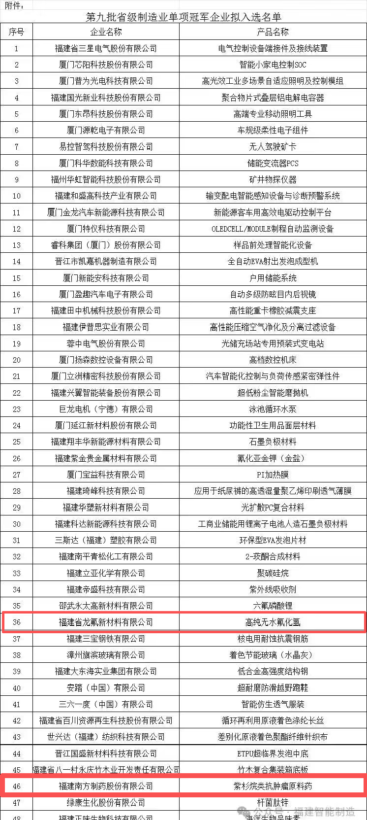 近日,福建省工业和信息化厅公布2025年福建省级制造业单项冠军企业名单,福创投已投企业福建南方制药股份有限公司、福建德尔科技股份有限公司全资子公司福建省龙氟新材料有限公司入选名单。